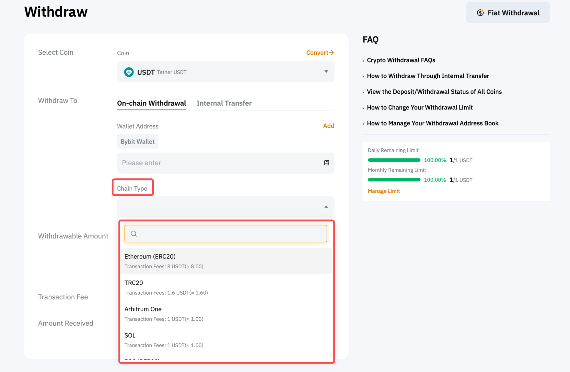 Step 4: Enter the amount you want to withdraw, or click on All to make a full withdrawal. Once the chain type is selected, the minimum withdrawal limit for this particular coin and blockchain network will be indicated in the withdrawable amount field. You’ll also find the daily and monthly remaining limits for withdrawal on the right side of the page. To change your withdrawal limit, follow the guide here.