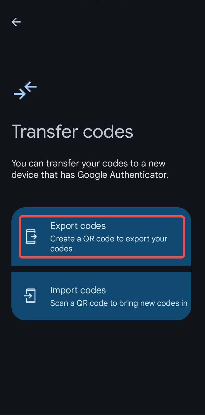 Toque na opção Exportar códigos e selecione uma conta para trazer o código para um novo dispositivo por meio de uma verificação QR.