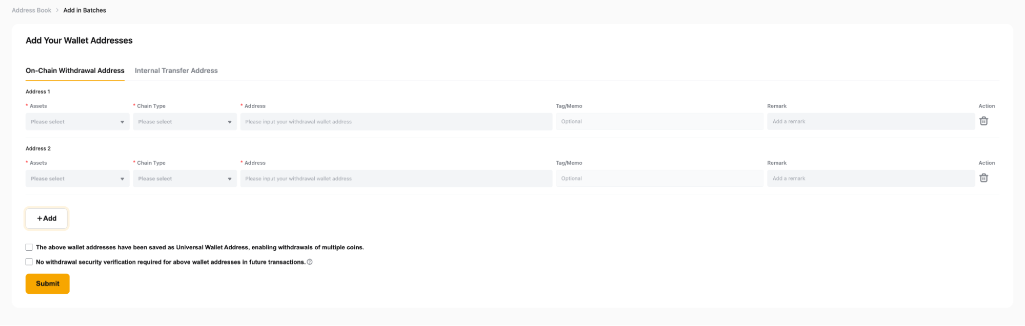 If you would like to add wallet addresses in batches for on-chain withdrawal address and internal transfer address, please take note of the following: