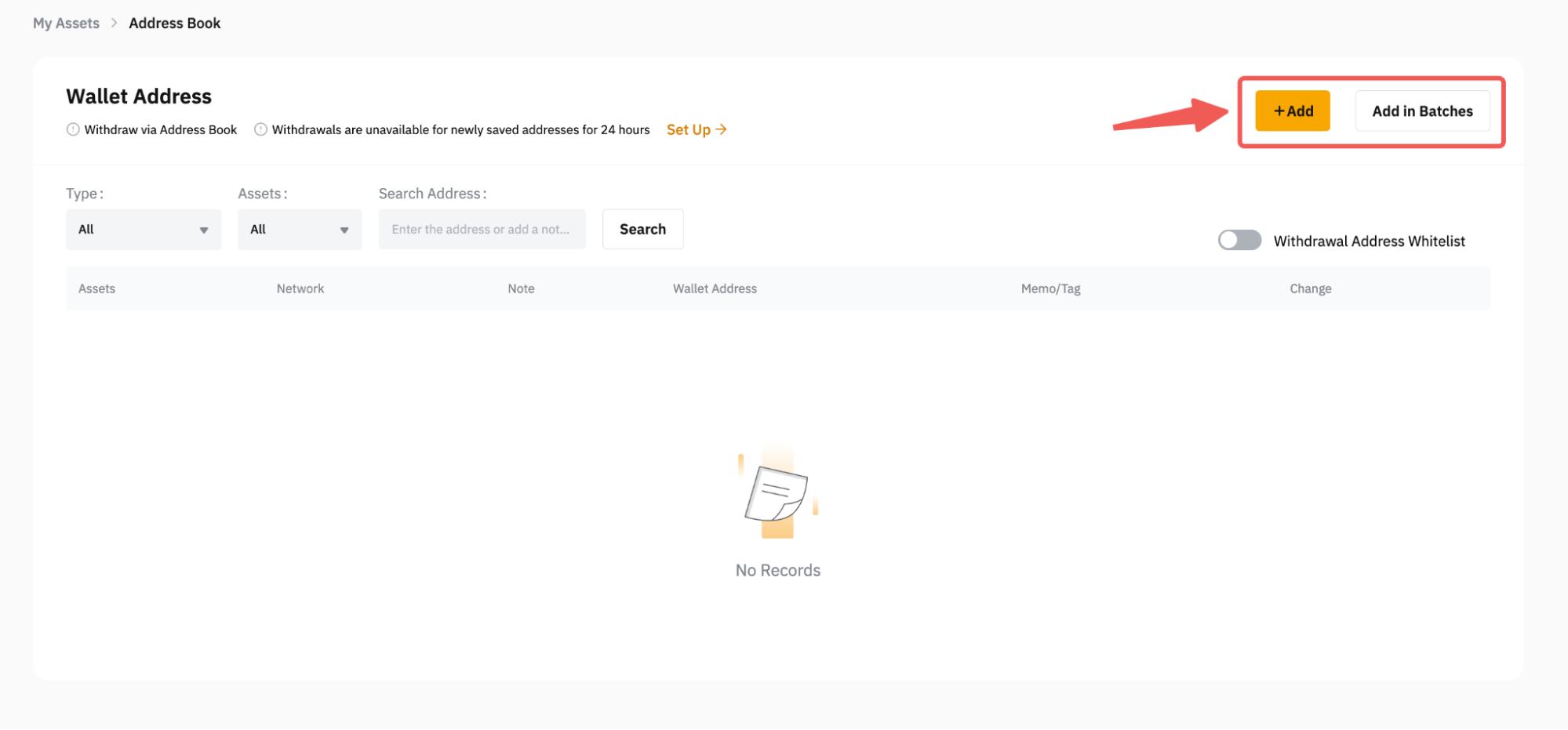 1. Once you’re on the Wallet Management page, please click on the Add button at the top right corner of the page to add a new wallet address. If you would like to add several addresses at the same time, please click on Add in Batches.