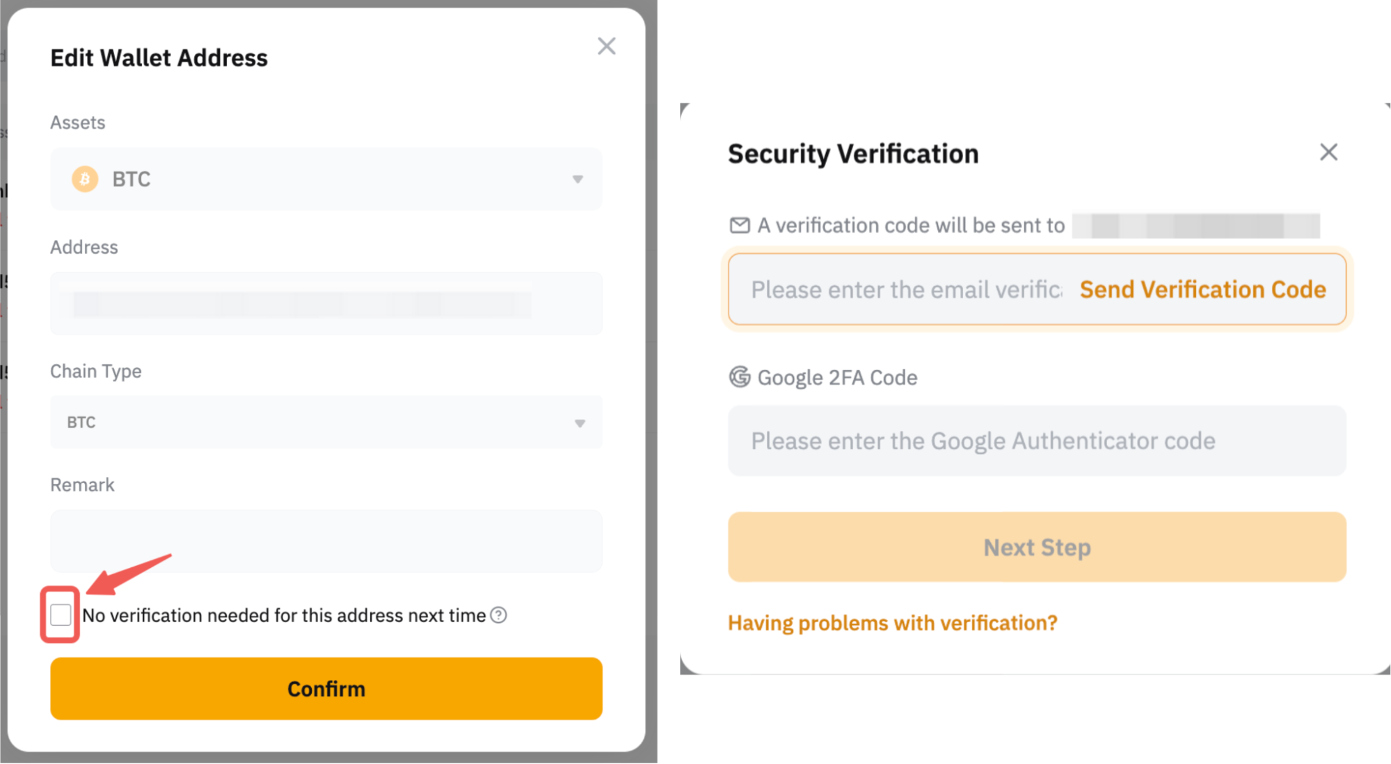 • Check the box below if you want to enable the Saved as Universal Wallet Address or No verification needed for this address next time function. However, please take note that the security verification might also be required if there is any unusual activity detected on your account.