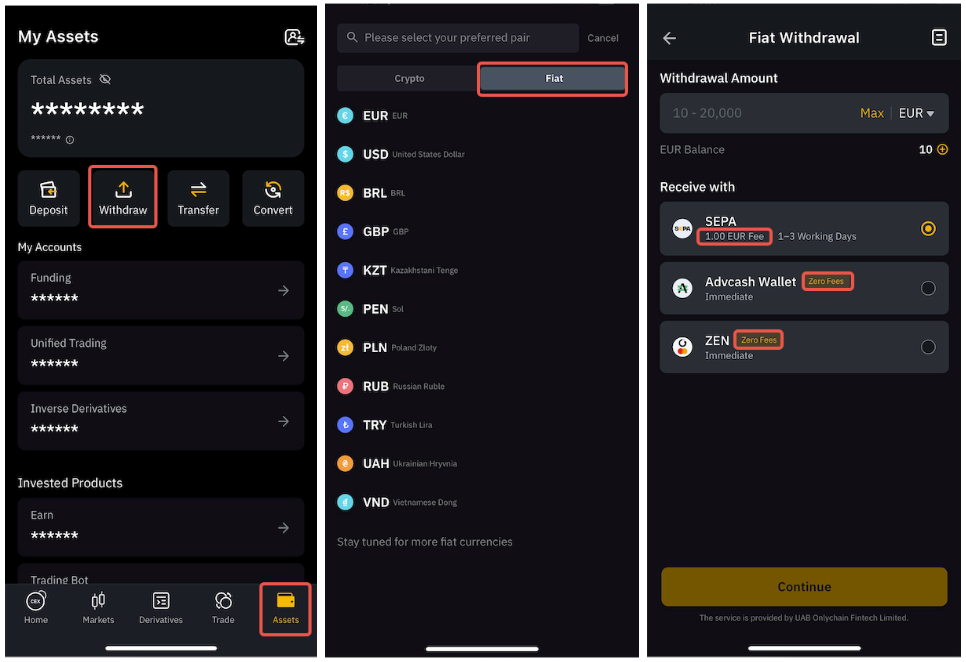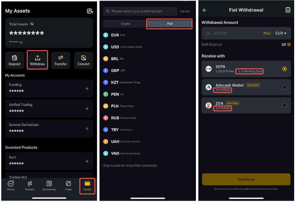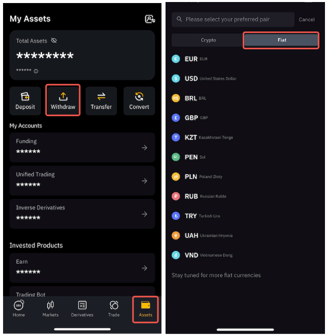 В мобильном приложении перейдите во вкладку Активы и нажмите Вывод средств, затем перейдите в раздел Фиат, чтобы увидеть список поддерживаемых опций.