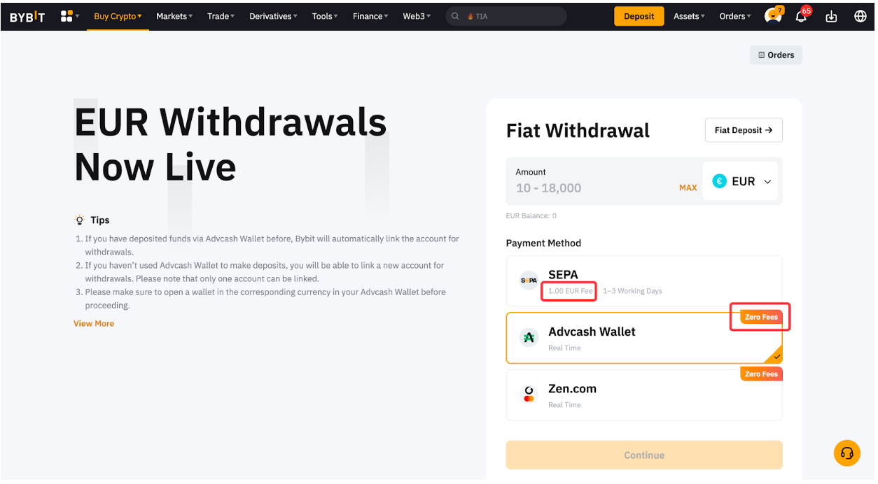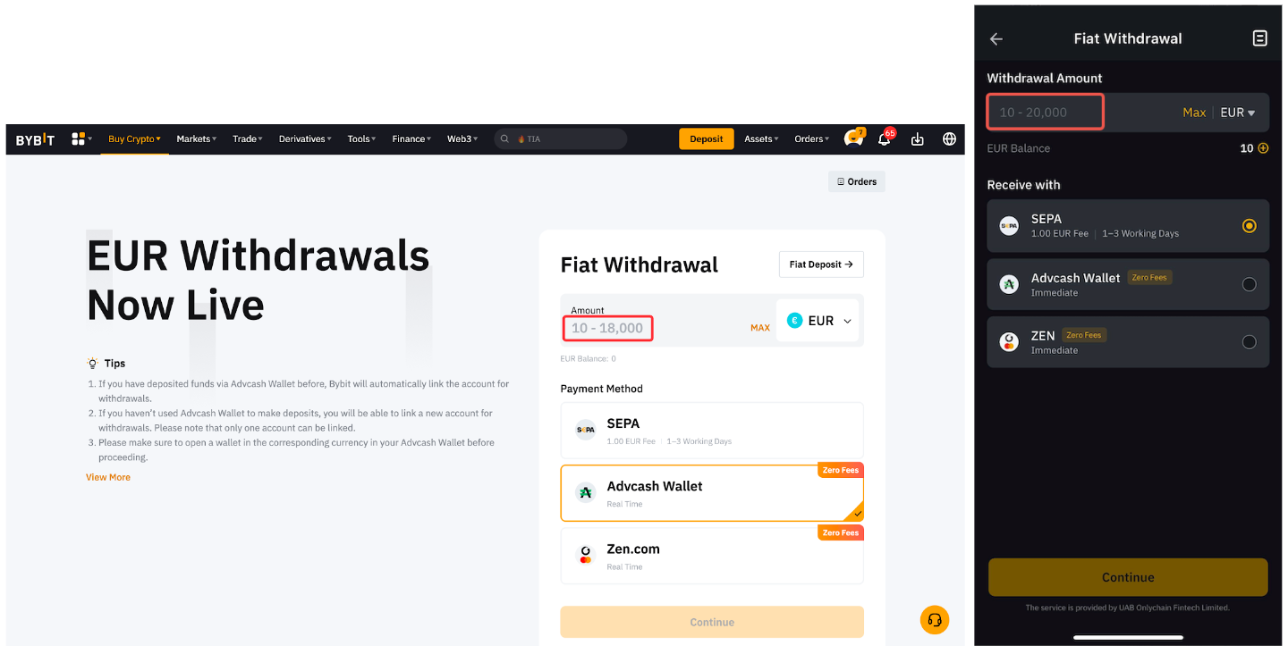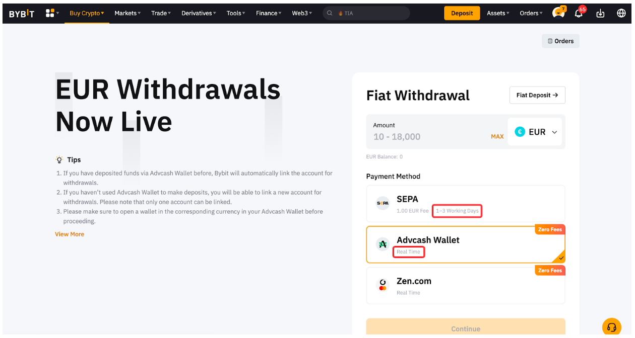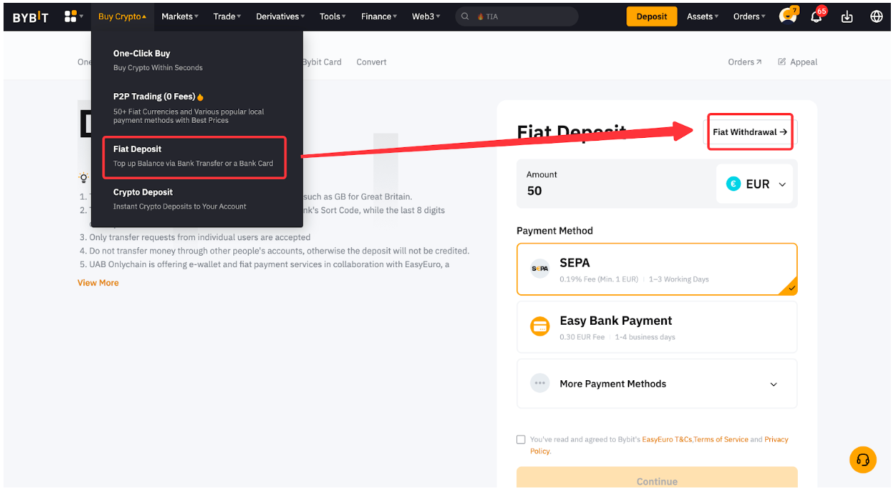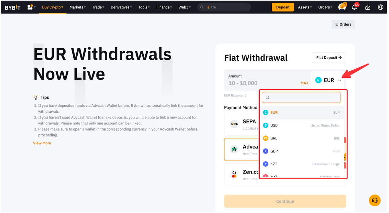 Для вывода на Bybit доступно ограниченное количество фиатных валют. Вы можете увидеть какие фиатные валюты поддерживаются для вывода, если перейдете на страницу своего аккаунта финансирования и нажмете на кнопку вывода фиатных средств. Дополнительную информацию Вы можете найти здесь.