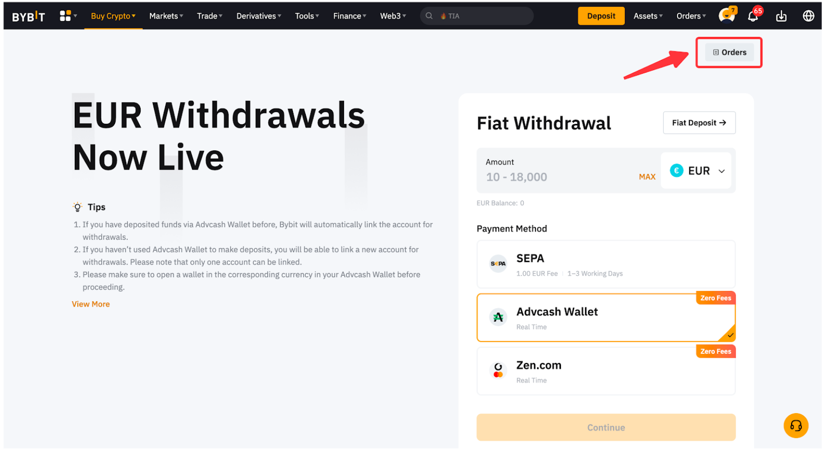Чтобы открыть историю выводов, перейдите в раздел Ордера в правой верхней части навигационной панели на сайте Bybit.