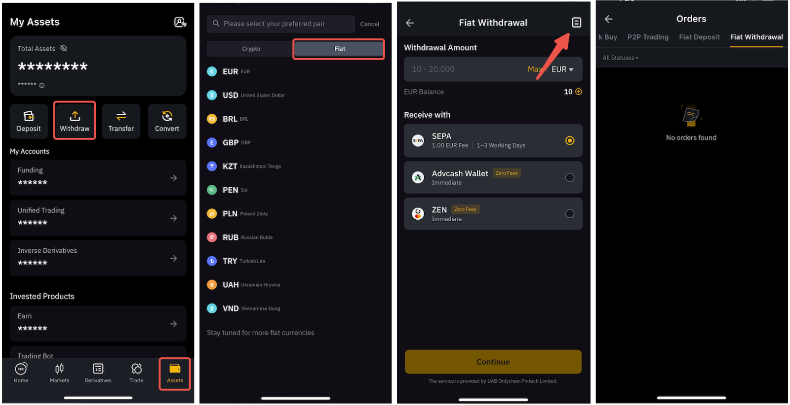 Чтобы узнать больше о том, как вывести фиатную валюту, ознакомьтесь с доступными статьями для каждой валюты здесь.