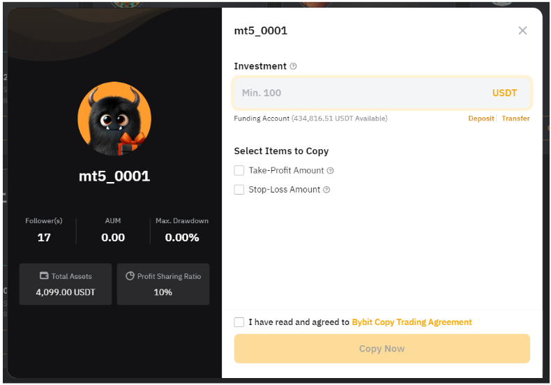 Шаг 3: Начните копировать сделки, указав сумму инвестиций и TP/SL.