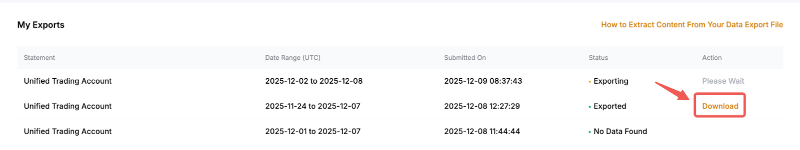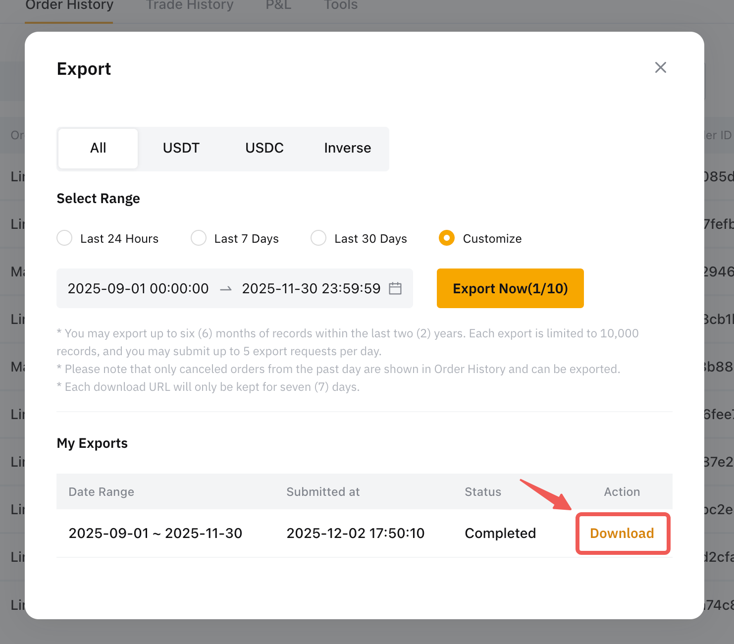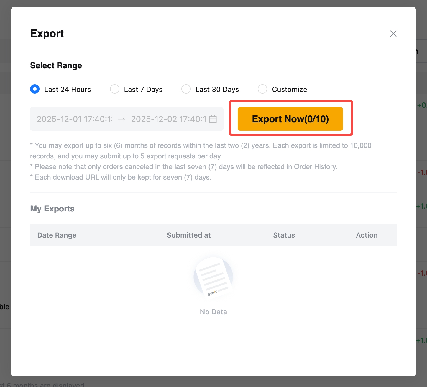 - Each export is limited to 10,000 entries, and you may submit up to ten (10) export requests per day for Spot Orders and up to five (5) export requests for Derivatives Orders.