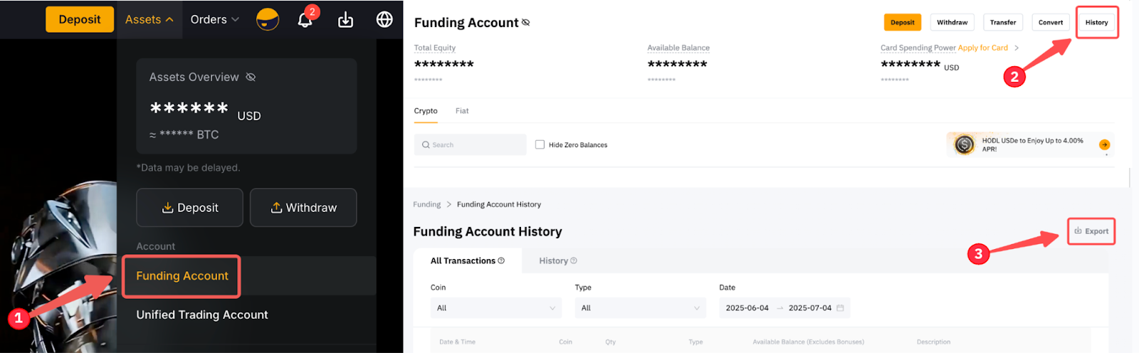 Alternatively, go to Assets → Funding Account → History → Data Export.