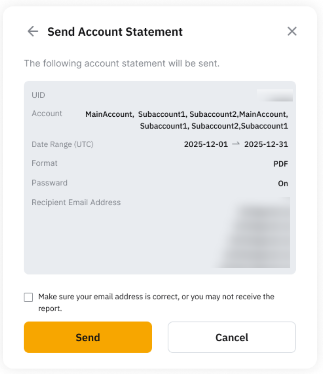 Step 4: Review the Send Account Statement confirmation details and tick the checkbox to acknowledge the report-sending policy. Then, click Send to proceed.