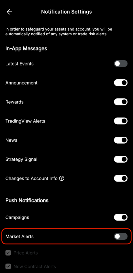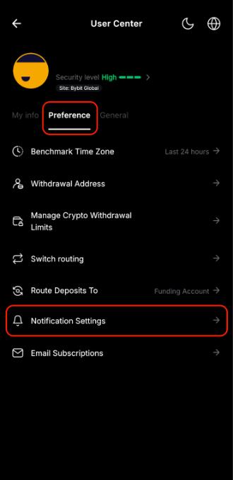 To turn off Bybit’s Market Alerts, you can go to the Settings page by clicking on the profile icon on the top left corner of the homepage and click on the Settings icon. Then, click on Preference → Notification Settings where you can define the type of notifications you want to receive on your phone from the Bybit App.