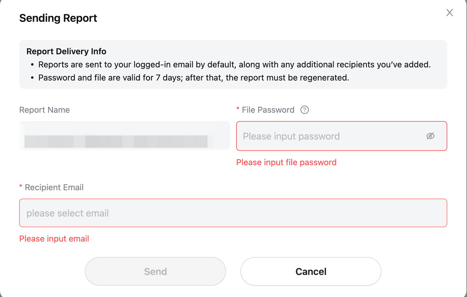 - The password and file are valid for 7 days. If they expire, the report must be regenerated.
