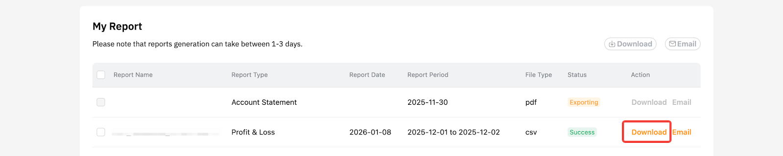 Step 1: Under "My Report", select the report you want to download, and click "Download".