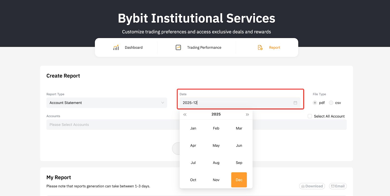 Institutional Reporting is a self-service data exporting tool within the Bybit Institutional Portal. PRO users and Marker Makers can download and share the reports of their main accounts and subaccounts activities internally and externally if necessary.
