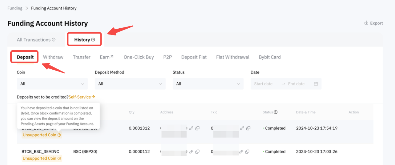 - If you see an unsupported coin remark in the deposit record, please follow the A) Self-Service guide below which allows you to initiate a withdrawal.