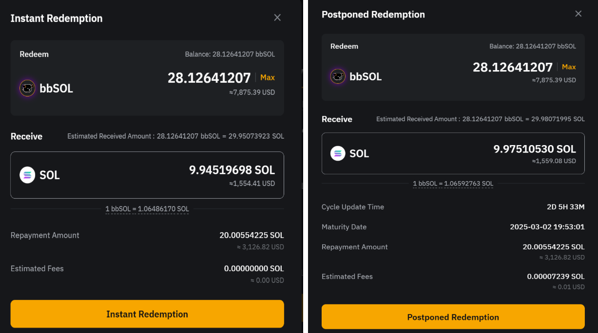 • Canje pospuesto: Obtén tu capital completo y todas las ganancias después de un período de procesamiento de 1 a 4 días, durante el cual se seguirán acumulando intereses. Tus bbSOL se convertirán a SOL a la tasa de cambio en tiempo real cuando envíes tu solicitud de canje.