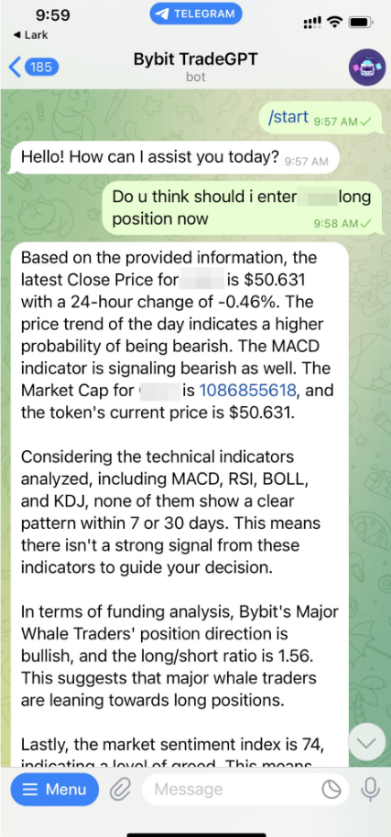 Fácil acceso y análisis experto: conéctate directamente con TradeGPT en Telegram para acceder fácilmente a datos en tiempo real de Bybit y datos analíticos punteros que facilitan el análisis avanzado.