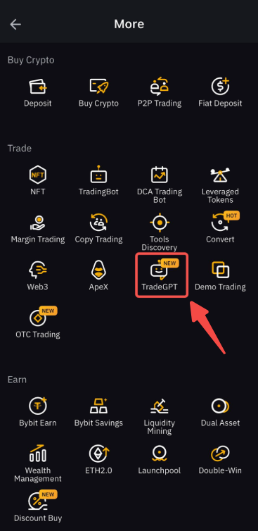 Los usuarios de la aplicación Bybit pueden acceder a TradeGPT haciendo clic en Más en la página de inicio de Bybit y seleccionando TradeGPT.