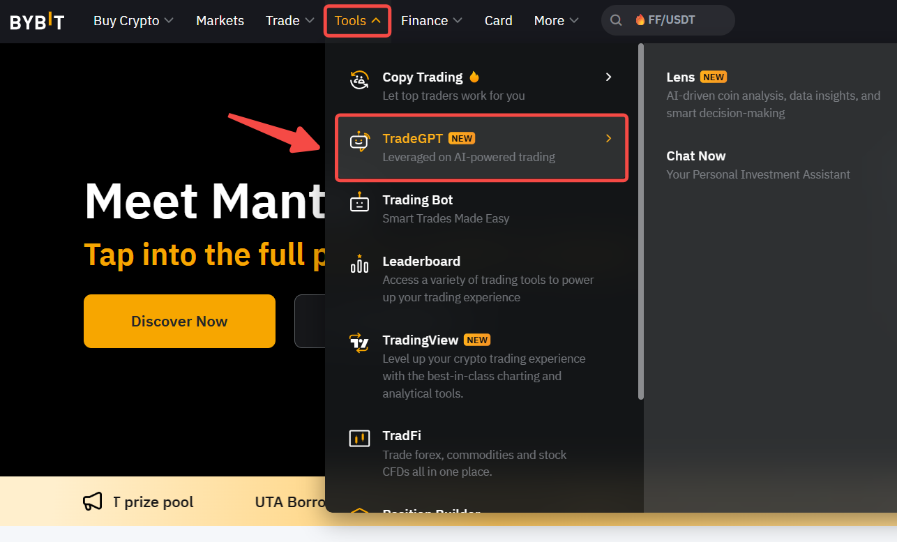 Los usuarios del sitio web de Bybit pueden hacer clic en este enlace o navegar a Herramientas en la barra de navegación de la página Bybit y seleccionar TradeGPT.