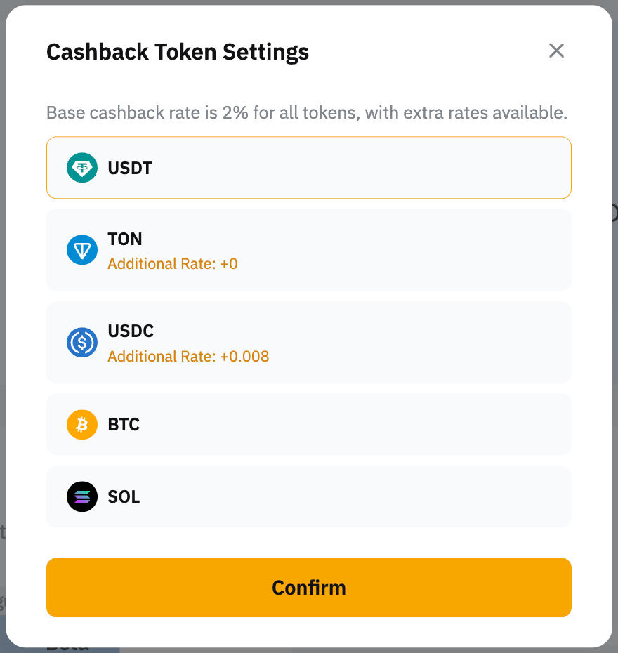 • Si deseas cambiar el token de reembolso a otro, toca el icono de moneda y selecciona el token de reembolso automático que deseas recibir.