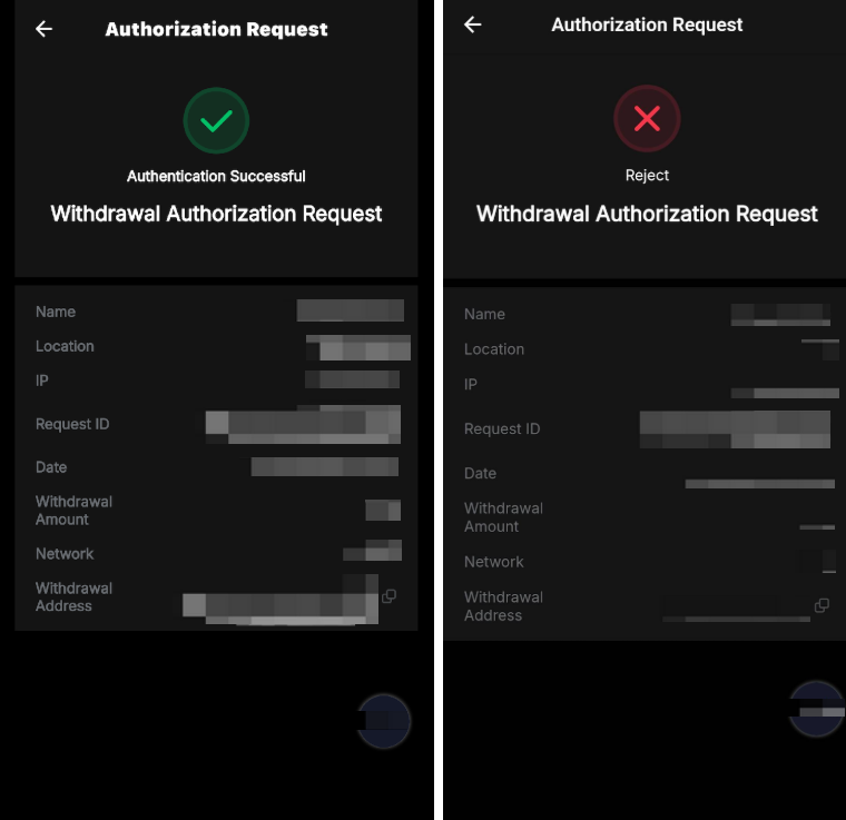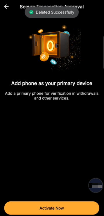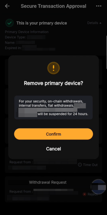 Una vez activado, configurarás un teléfono específico como tu dispositivo principal. Todos los demás dispositivos serán tratados como secundarios. Si inicias un retiro u otra transacción desde un dispositivo secundario o desde el sitio web de Bybit, se enviará una solicitud de verificación a la aplicación Bybit de tu dispositivo principal. Puedes aprobar la transacción o rechazarla si parece sospechosa.
