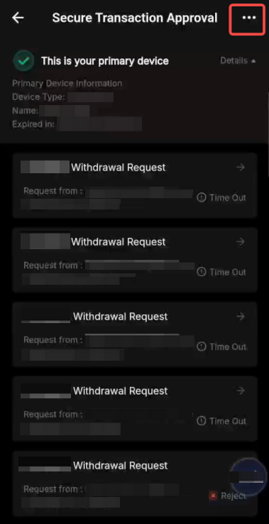 Paso 1: En la página de Aprobación segura de transacciones, toca el ícono de tres puntos en la esquina superior derecha y selecciona Eliminar dispositivo principal.