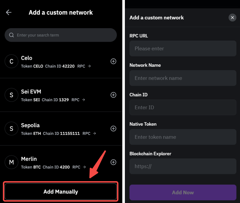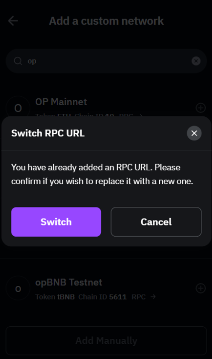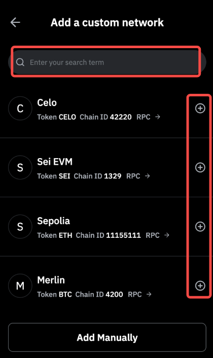 Paso 2: Introduce un nombre de red válido y, una vez que hayas encontrado la red, toca el icono + para añadirlo a tu billetera.