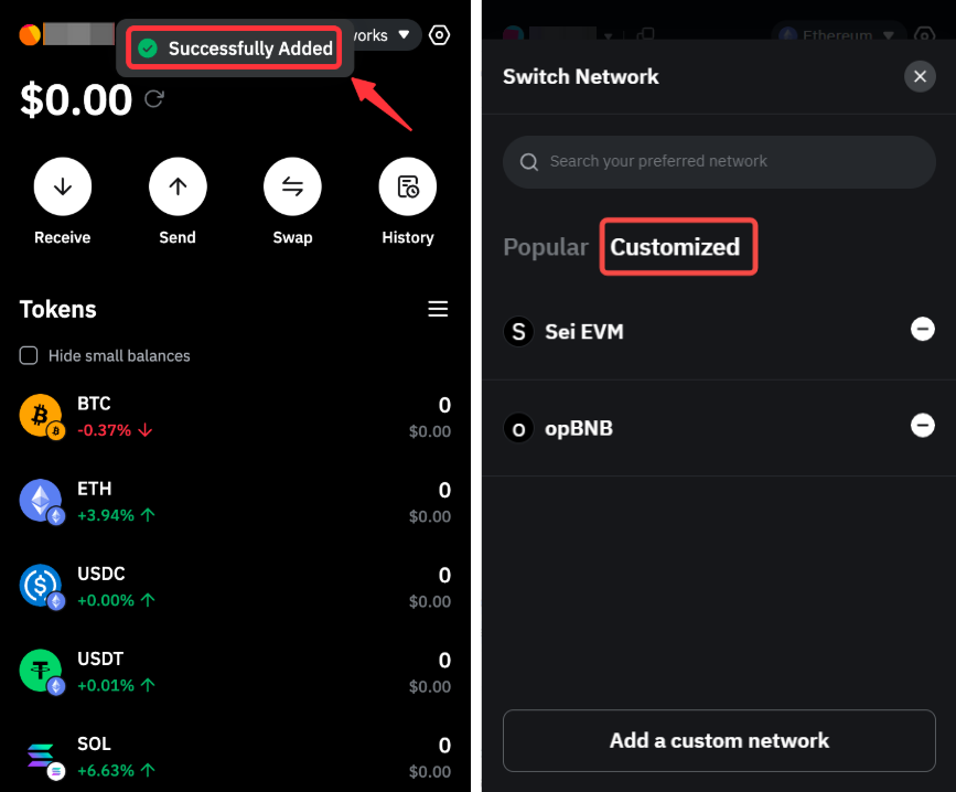 La red se añadirá correctamente a tu billetera Bybit. Puedes ver todas tus redes personalizadas en la pestaña Personalizado de la página Red.