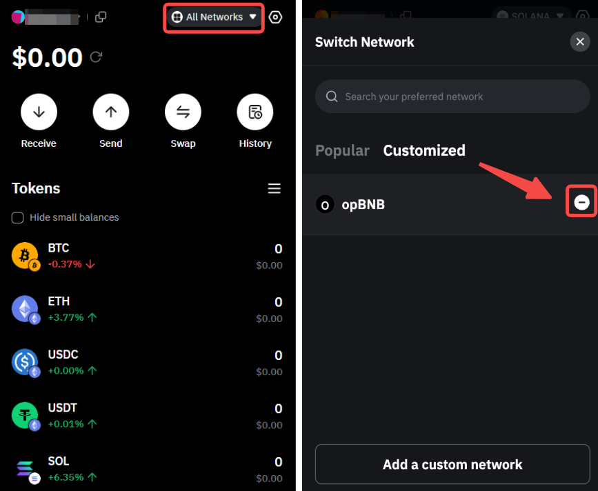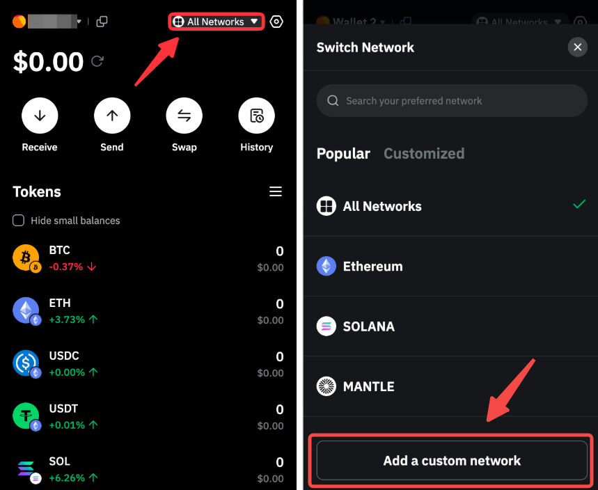 Paso 1: Para añadir una red personalizada, abre la extensión Bybit Wallet y haz clic en Todas las redes → Añadir una red personalizada.