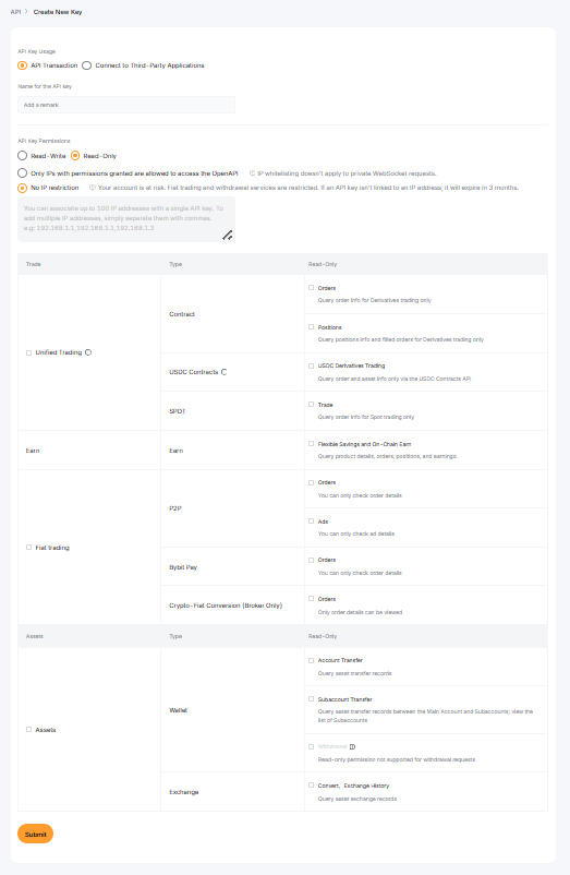 Paso 3: Configure su clave API. Asegúrese de establecer los permisos de la clave API como Solo lectura. Haga clic en Enviar una vez hecho.