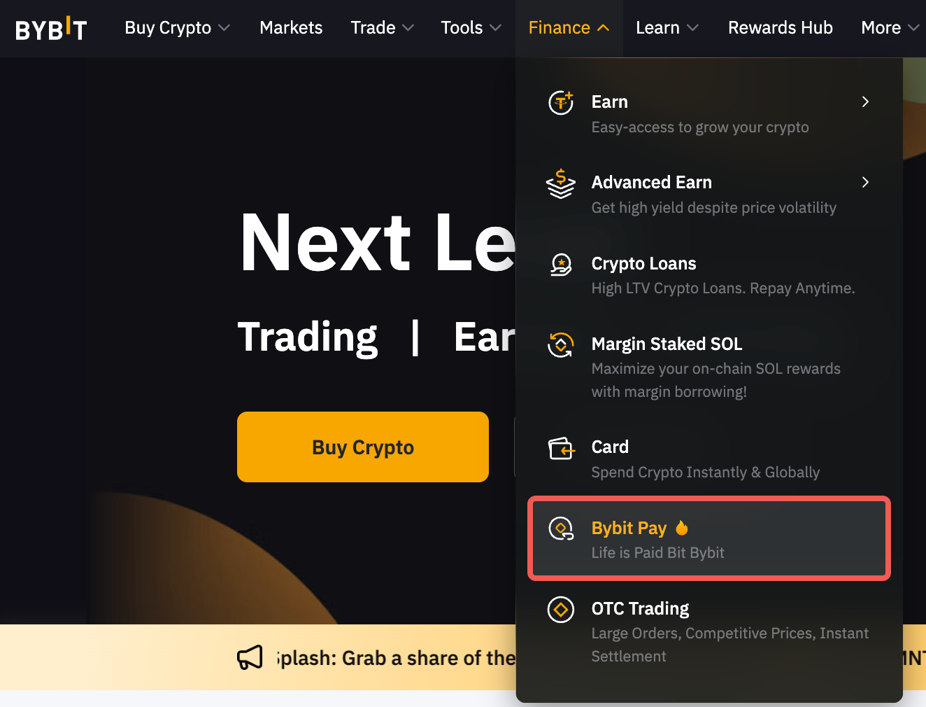Paso 1: Diríjase a Finanzas en la esquina superior izquierda de la barra de navegación en la página Bybit y, a continuación, seleccione Bybit Pay para entrar en la página Bybit Pay.