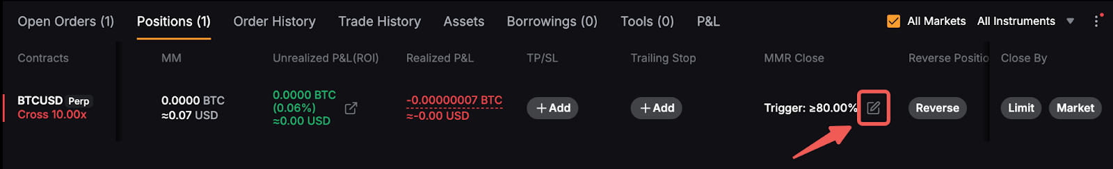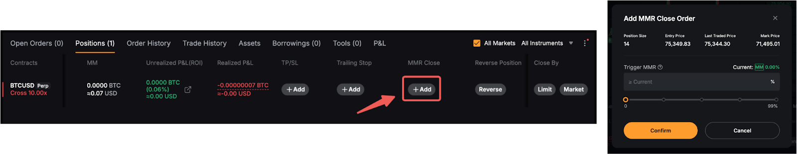 Haga clic en Añadir en Cierre de MMR en su pestaña de posición. A continuación, establezca la MMR de activación como desee.