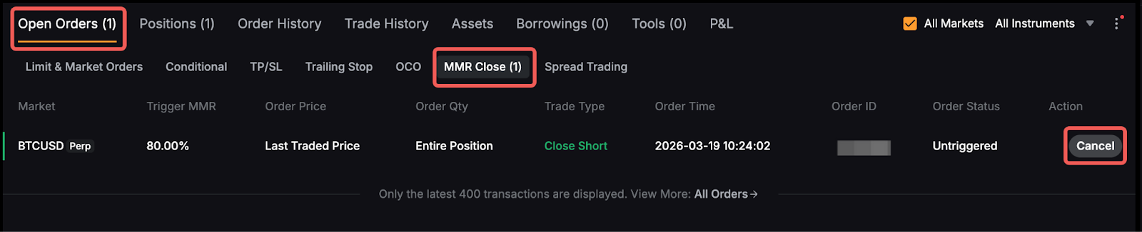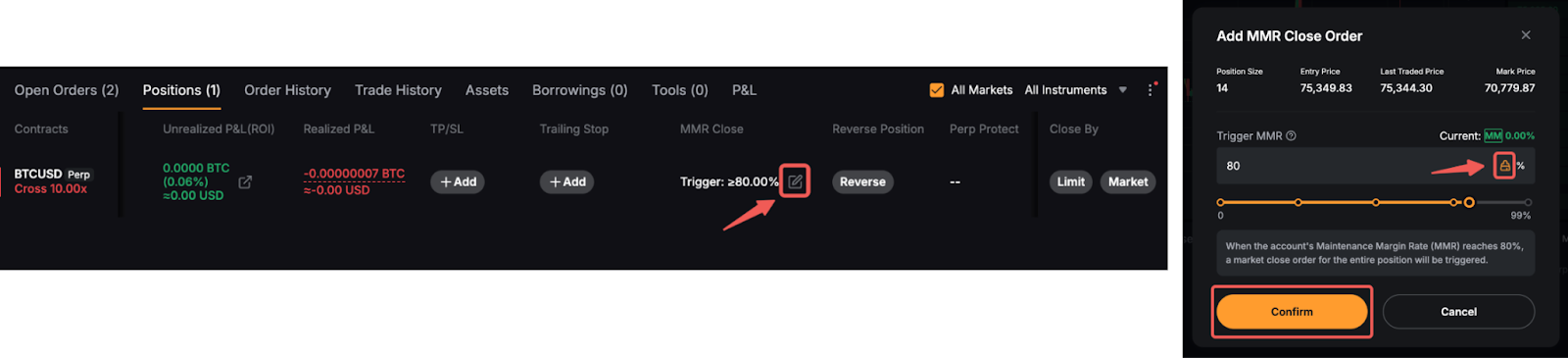 2. No se admite la creación de una orden de cierre de MMR para una cantidad parcial de la posición, y solo se puede establecer una orden de cierre de MMR para cada posición.