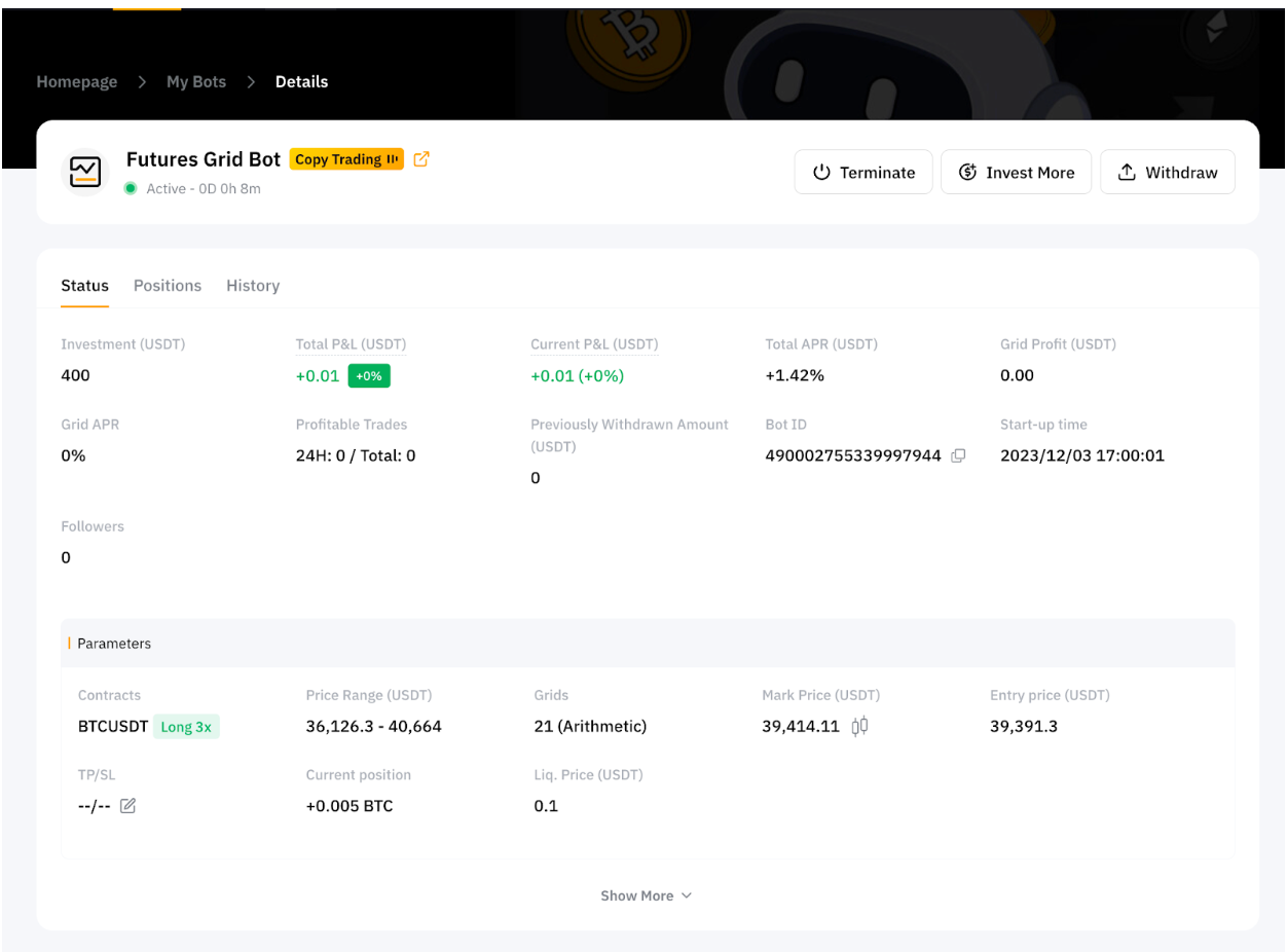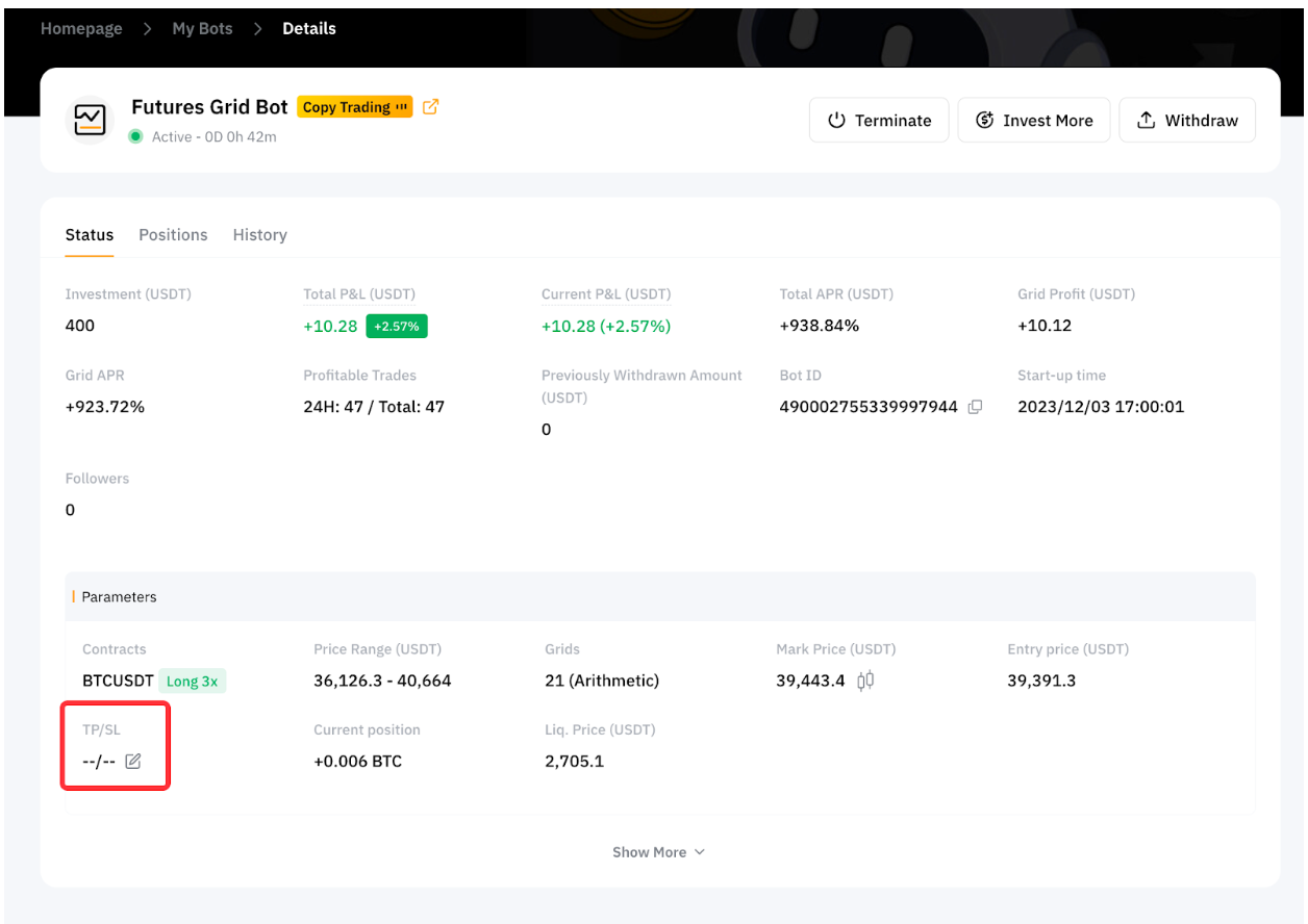 • USDTで利食/損切を設定した場合、それぞれのシンボルの最終取引価格が設定価格に到達すると、ボットは停止し、ポジションは市場価格で決済されます。