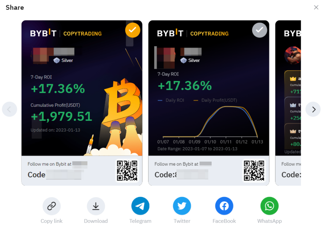 ワンクリックで、Telegram、X(旧Twitter)、Facebook、WhatsappなどのSNSアカウントで取引実績をシェアできます。