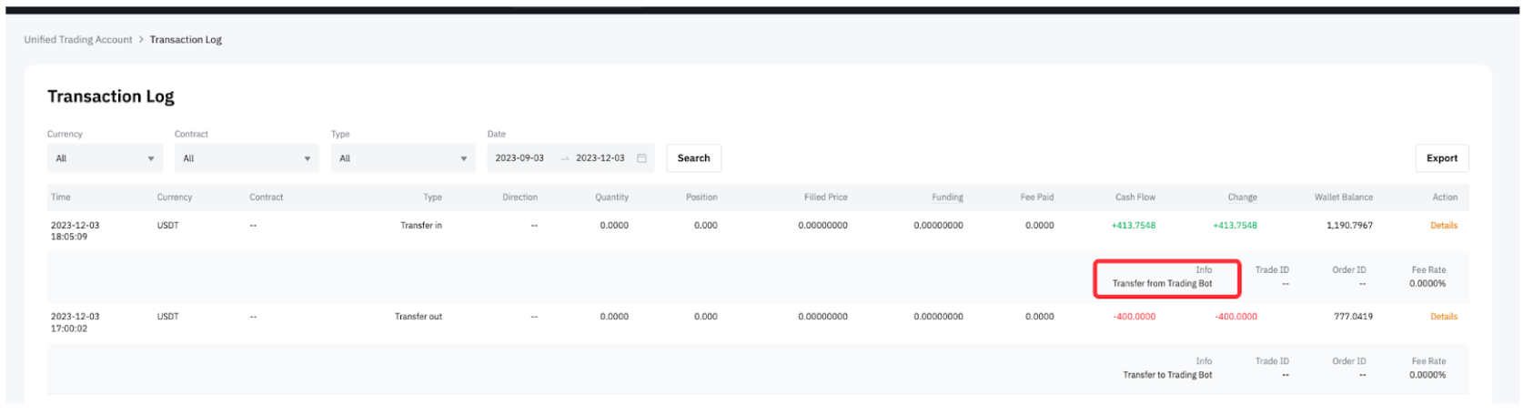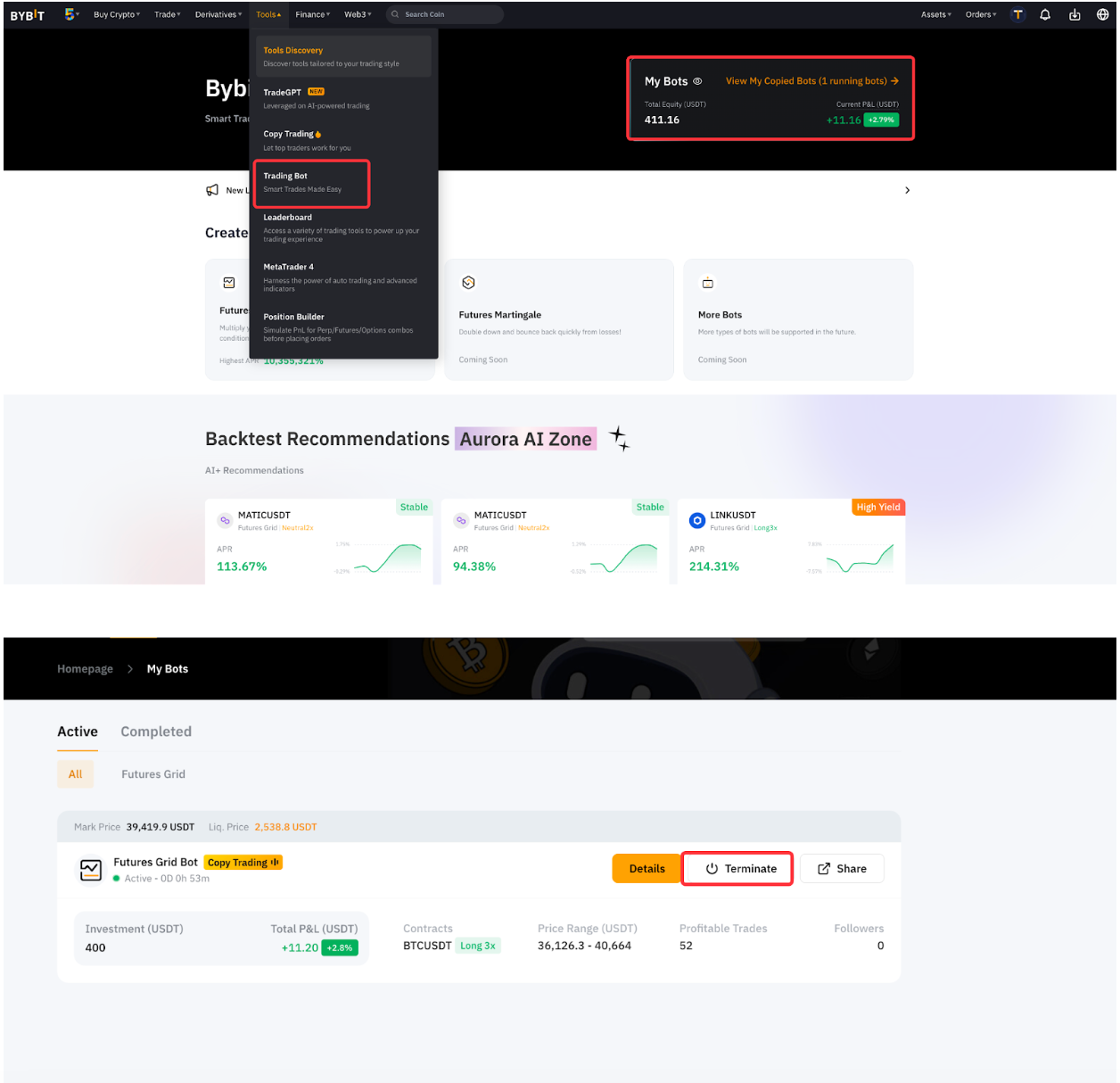 ボットを停止した場合、ボット内の約定待ちの注文はすべてキャンセルされ、ポジションは現在の市場価格で決済されます。資金は統合取引アカウント(UTAの利用者向け)またはデリバティブアカウントに返金されます。