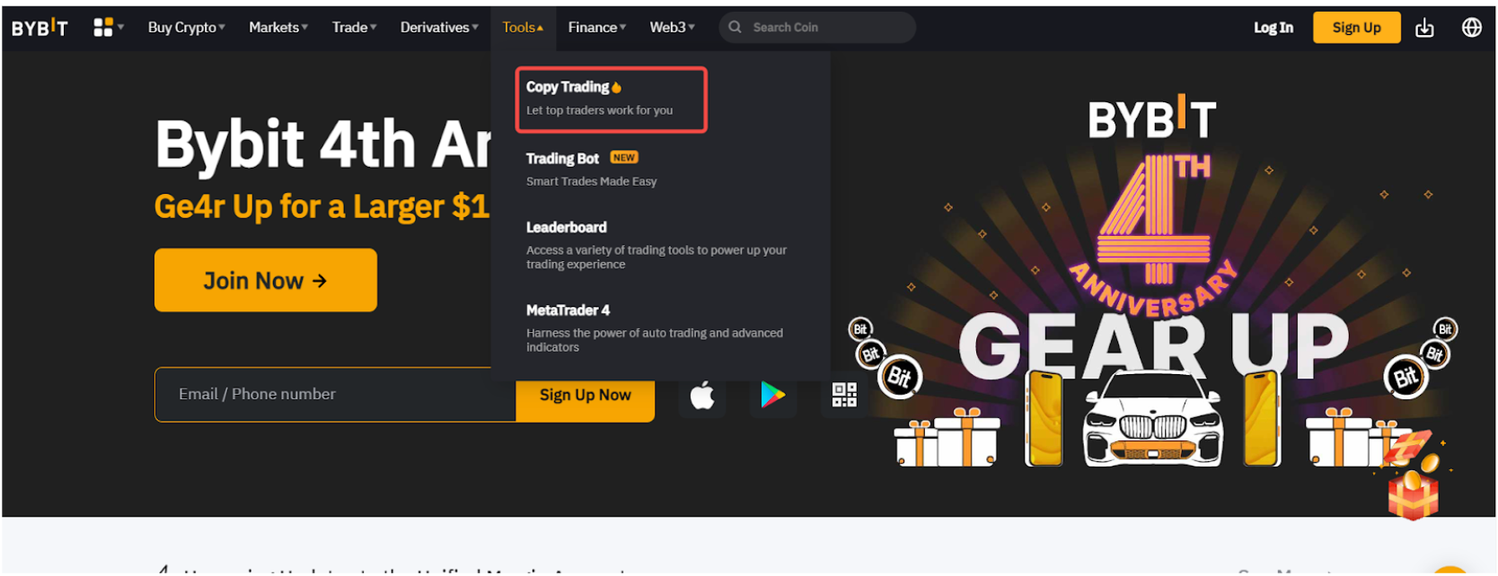 ステップ1:取引を開始またはボットを作成します。ナビゲーションバーで「ツール」→「コピートレード」をクリックして、「コピートレード」のページにアクセスします。