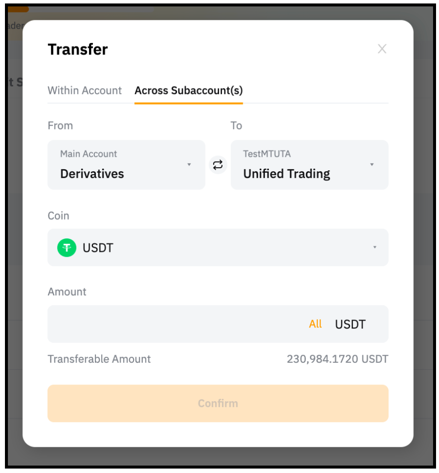 マスタートレーダーのサブアカウント内のデリバティブアカウントまたは統合取引アカウント(UTAの利用者向け)に、資金を振り替える必要があります。