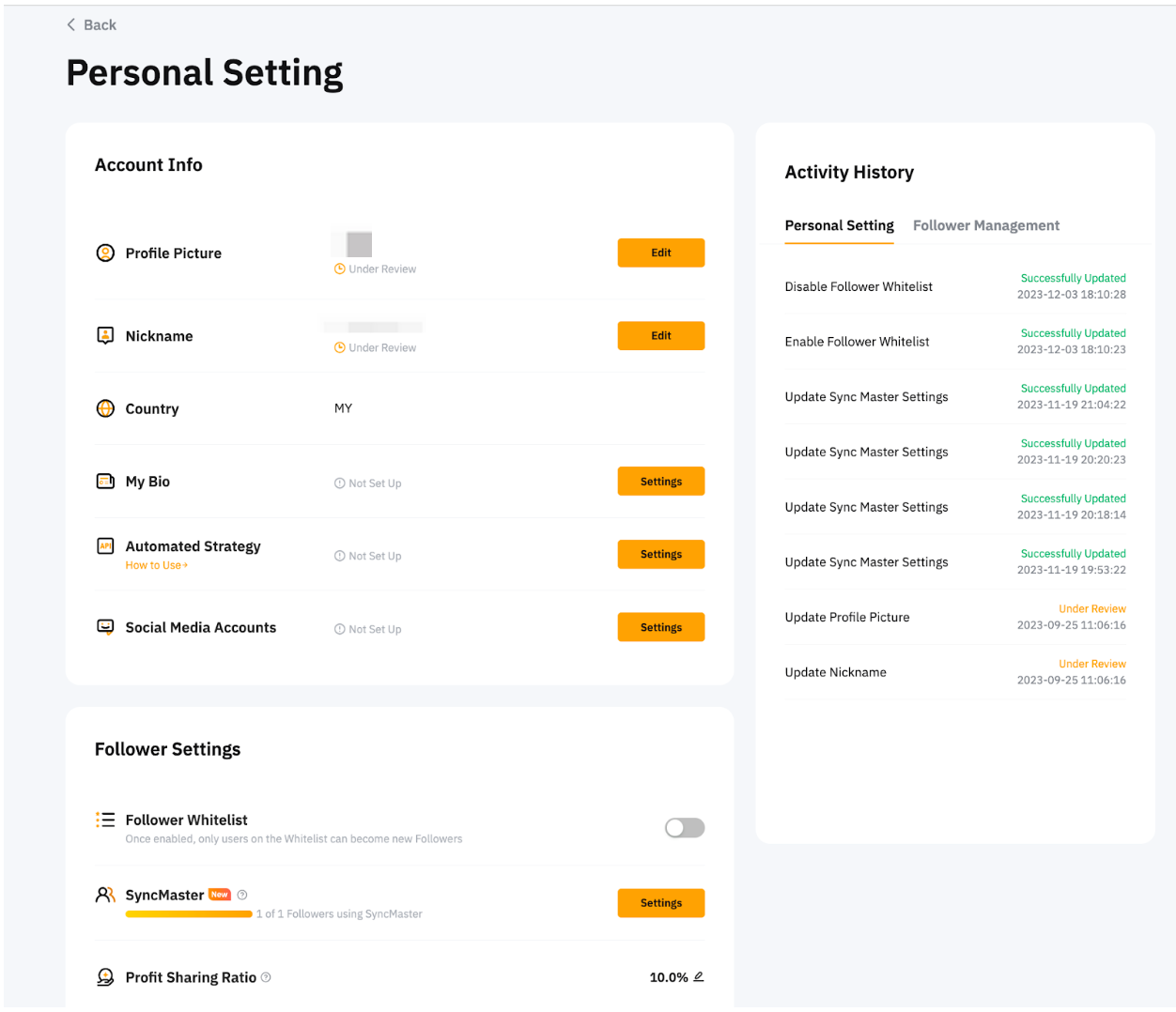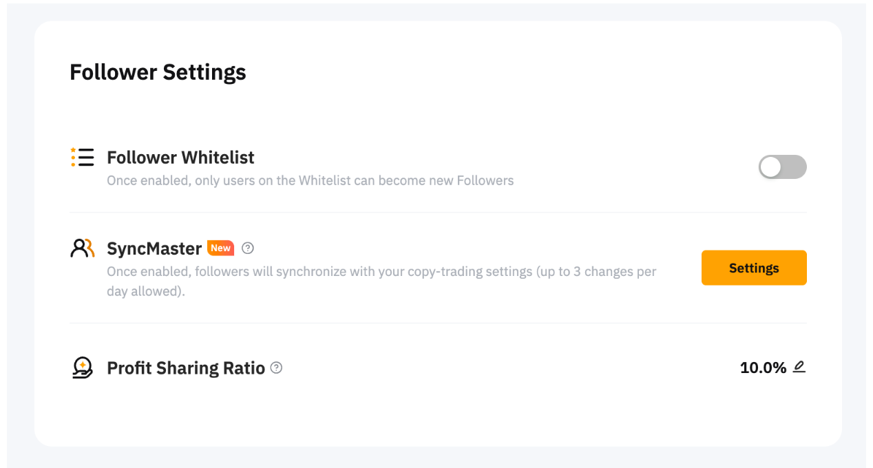 「フォロワー設定」では、「フォロワーホワイトリスト」「SyncMaster」「利益分配比率」を管理できます。