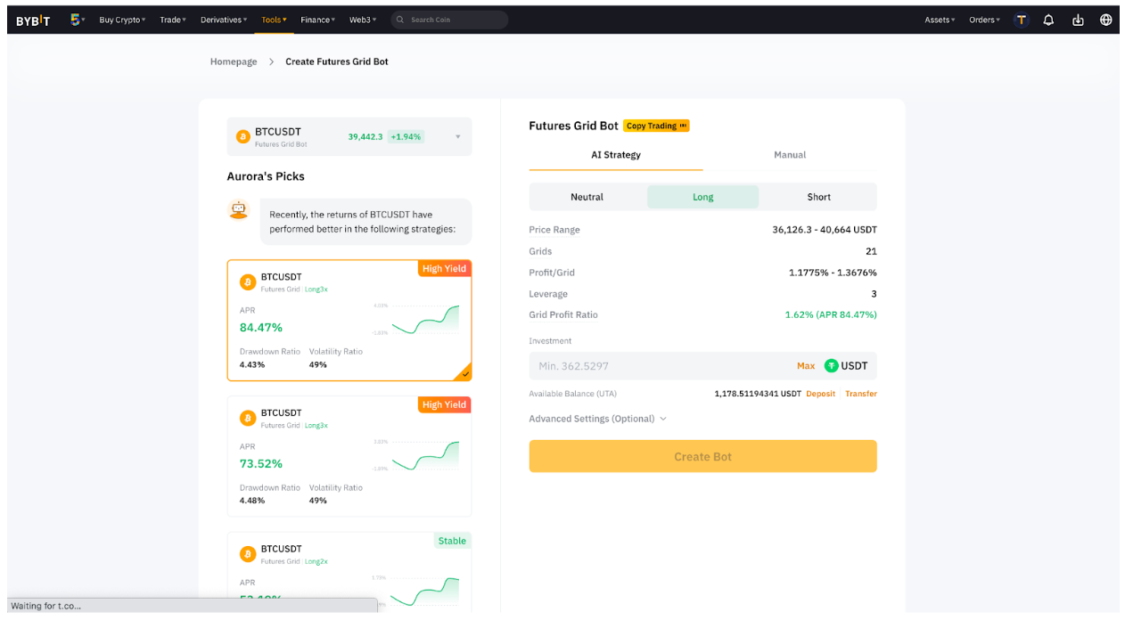 取引ボット:「ボットを作成」をクリックすると、デリバティブ取引ボットの作成ページに移動します。BybitのAurora AIが生成する推奨ボット戦略に従うか、または右側でボットのパラメータをカスタマイズできます。デリバティブ取引ボットについての詳細は、こちらをご確認ください。