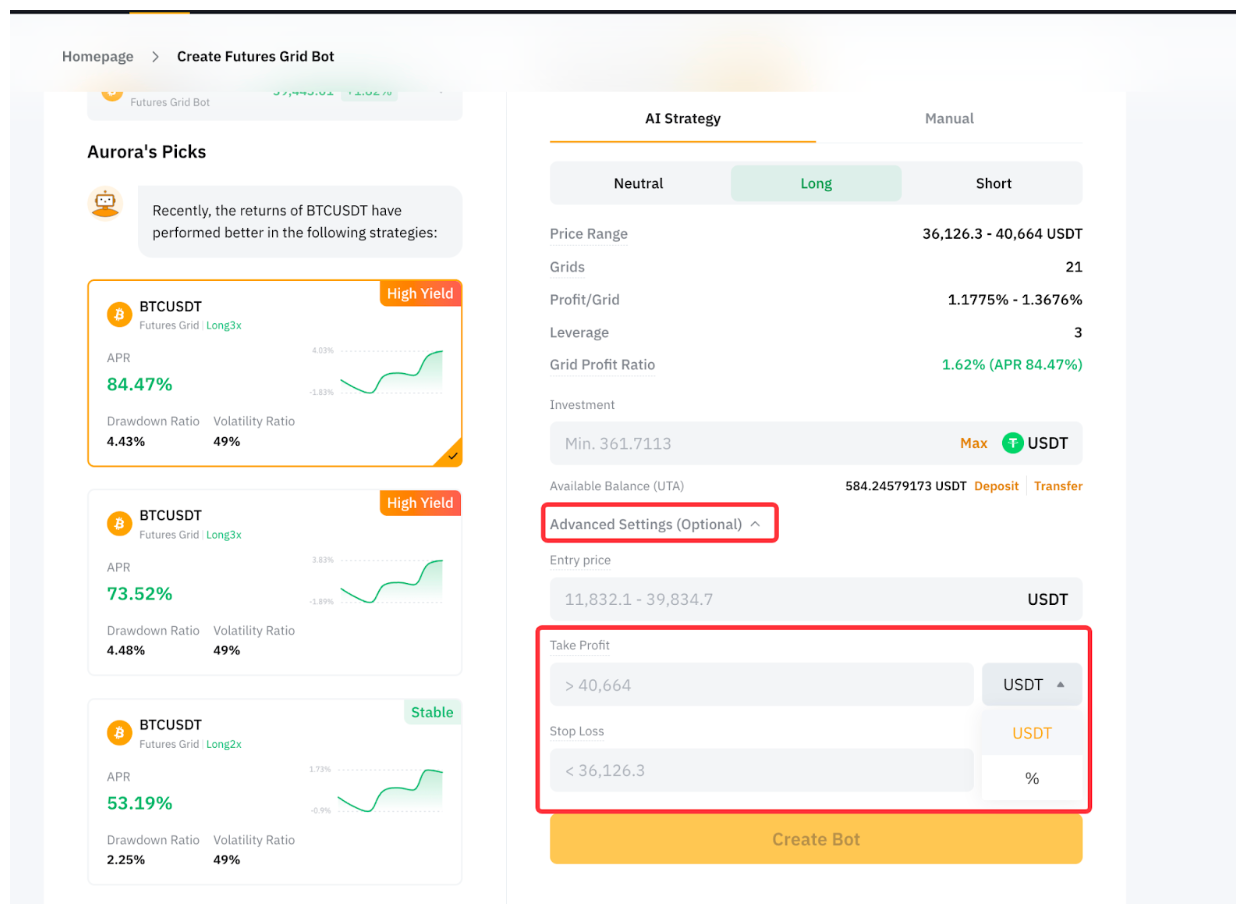ボットの作成時に、USDTまたはパーセンテージ(%)で利食いまたは損切りを設定できます。