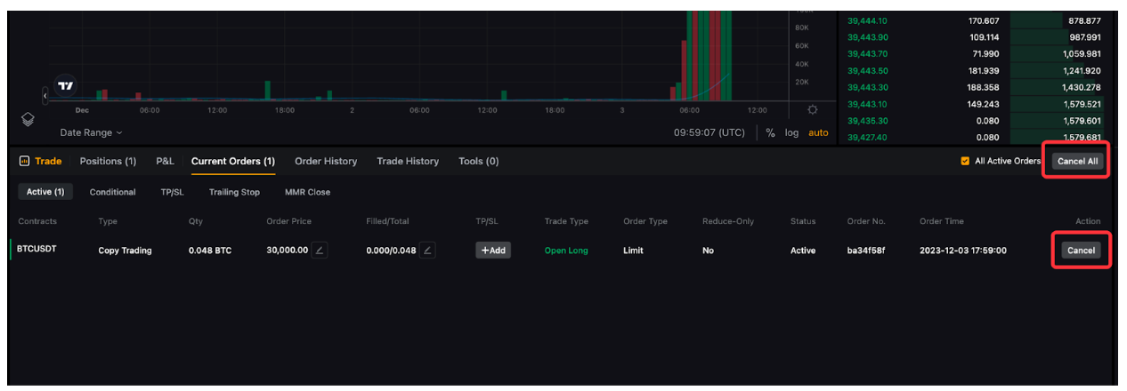 注文をキャンセルするには、無期限契約の取引ページの「現在の注文」タブに移動します。