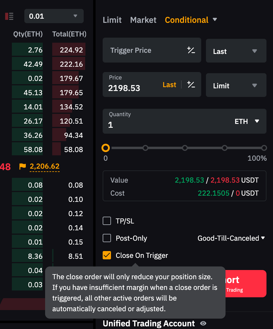 ご注意:注文数量が現在のポジションサイズを超える場合、反対方向に新しいポジションが建てられる可能性があります。これを回避するには、指値注文の場合は「リデュースオンリー」を、条件付き注文の場合は「トリガー時に決済」を有効にしてください。