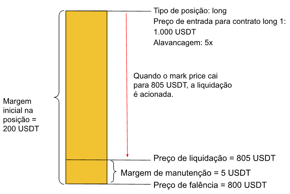 Na conta padrão, a liquidação ocorre quando o mark price atinge o preço de liquidação, resultando no fechamento da posição pelo preço de falência (equivalente ao nível de preço de margem de 0%). Na prática, isso indica que a perda não realizada esgotou o saldo da margem inicial abaixo do nível de margem de manutenção necessária.