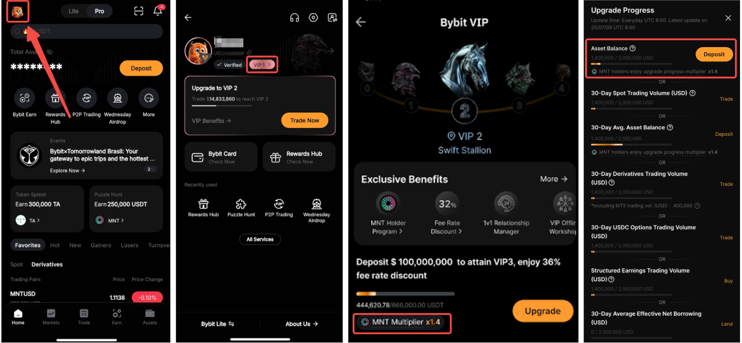Se você estiver usando o app, toque na sua foto do perfil no canto superior esquerdo e depois toque no seu nível VIP para ver o status do seu multiplicador de MNT.