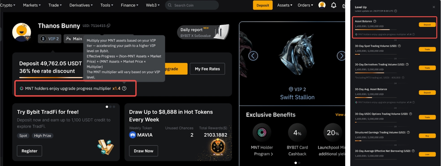 Um multiplicador de 1,5x é aplicado ao seu saldo de MNT, elevando o valor do MNT para US$ 97.500 (US$ 65.000 × 1,5). Somar 30.000 USDT eleva o valor total dos seus ativos para US$ 127.500, qualificando você para o VIP 1.