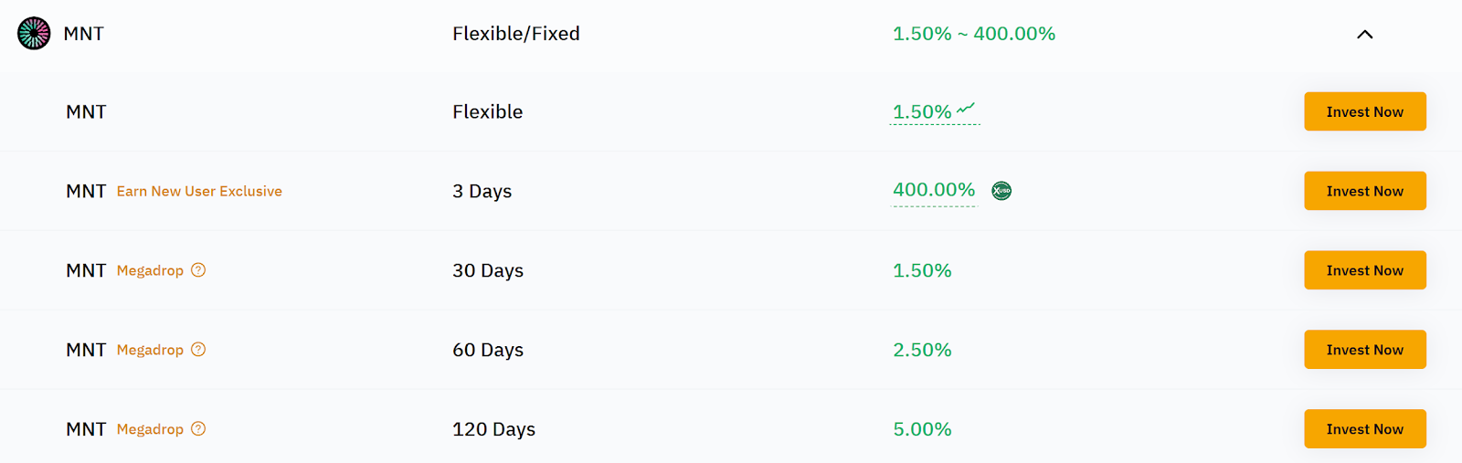 Mantenha o MNT para participar do Launchpool, Launchpad, Megadrop e Token Splash para acesso antecipado a novos tokens e alocações mais altas.