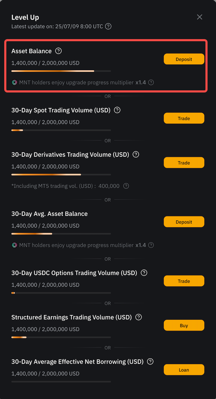 Observação: O multiplicador não se aplica ao VIP 5, pois o upgrade do VIP 5 para o Supreme VIP é baseado no volume de negociação de 30 dias, em vez do saldo dos ativos. Para obter mais detalhes, consulte Perguntas frequentes — Multiplicador MNT.