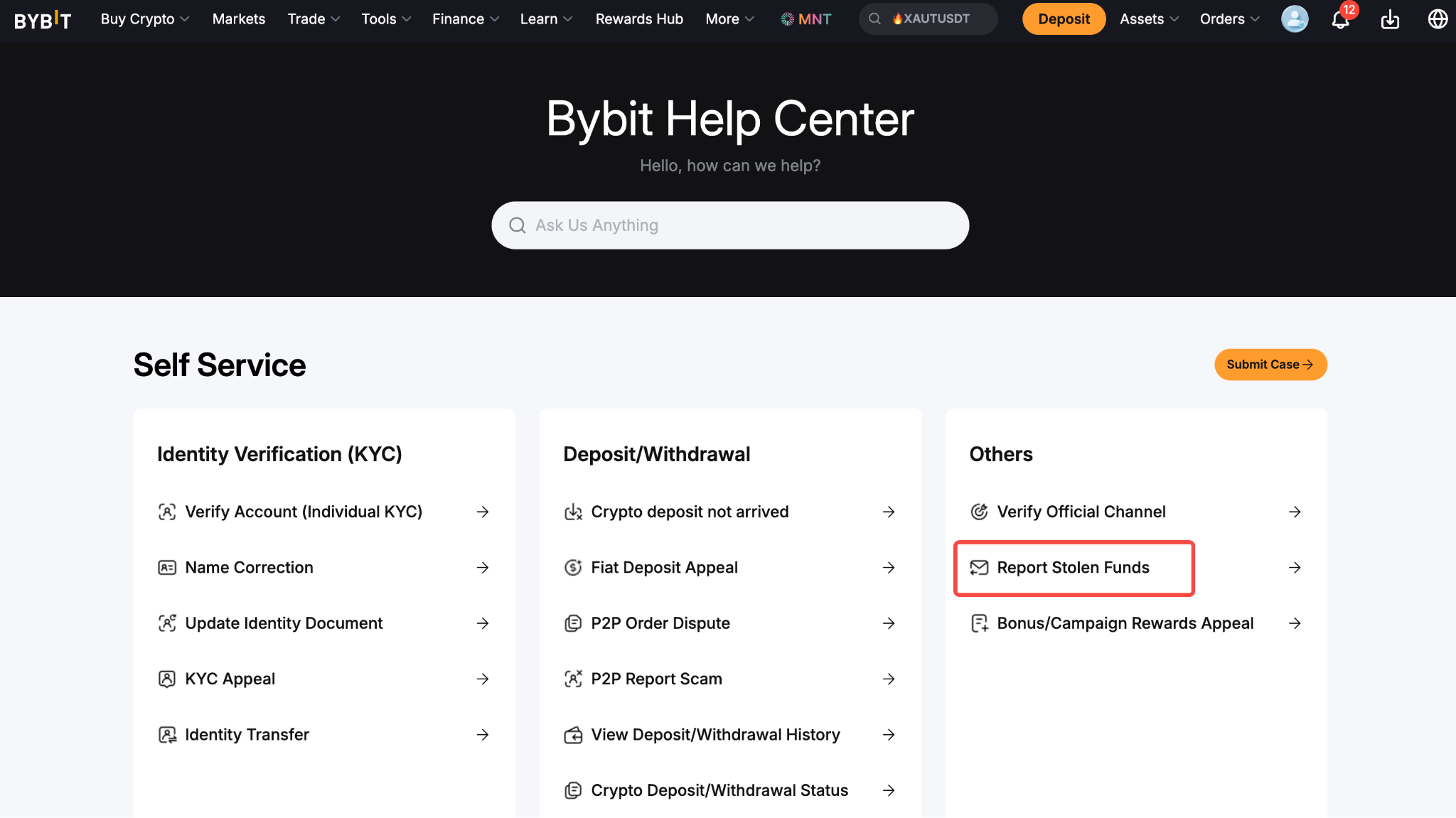 Перейдите на страницу Bybit-идентификатора и нажмите кнопку Отправить в разделе Сообщение об украденных средствах.
