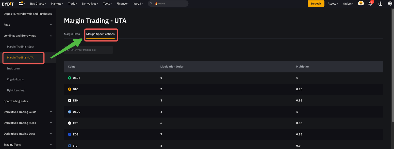 Натисніть на Видані та отримані позики → Маржинальна торгівля на UTA → Характеристики маржі, і ви можете побачити коефіцієнт вартості застави для кожної монети.
