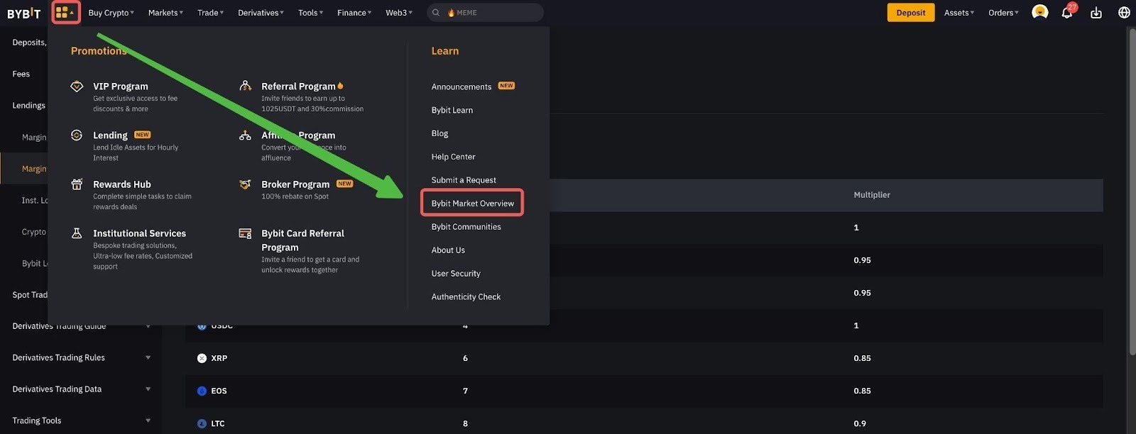 Щоб переглянути коефіцієнт вартості застави для кожної монети на Єдиному торговому акаунті, перейдіть до значка Додатку у верхньому лівому куті та виберіть Огляд ринку Bybit.